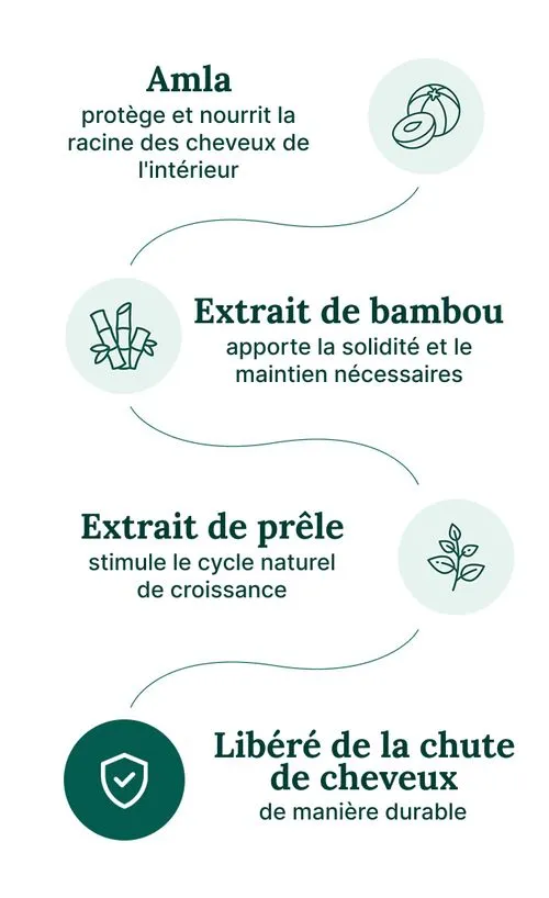 Elle repose sur la combinaison innovante de micronutriments, de principes actifs végétaux et de connaissances modernes en matière de soins capillaires.